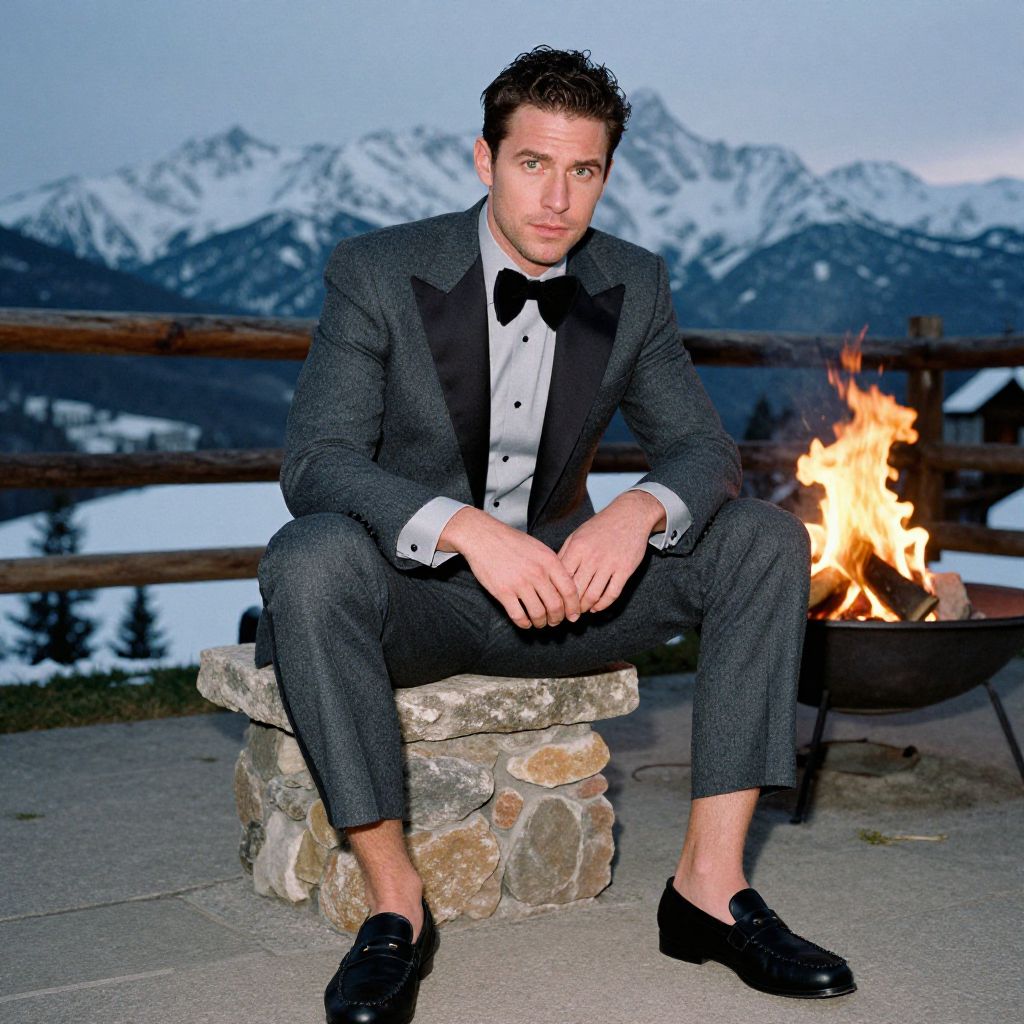 A man, charcoal gray tuxedo, peak lapels, light gray dress shirt, black velvet bow tie, matte black leather loafers, mountain lodge, snow-capped peaks, cozy fire pit, 3M ferrania analog film stock, confident expression, warm glow from the fire. Man has masculine face and piercing eyes