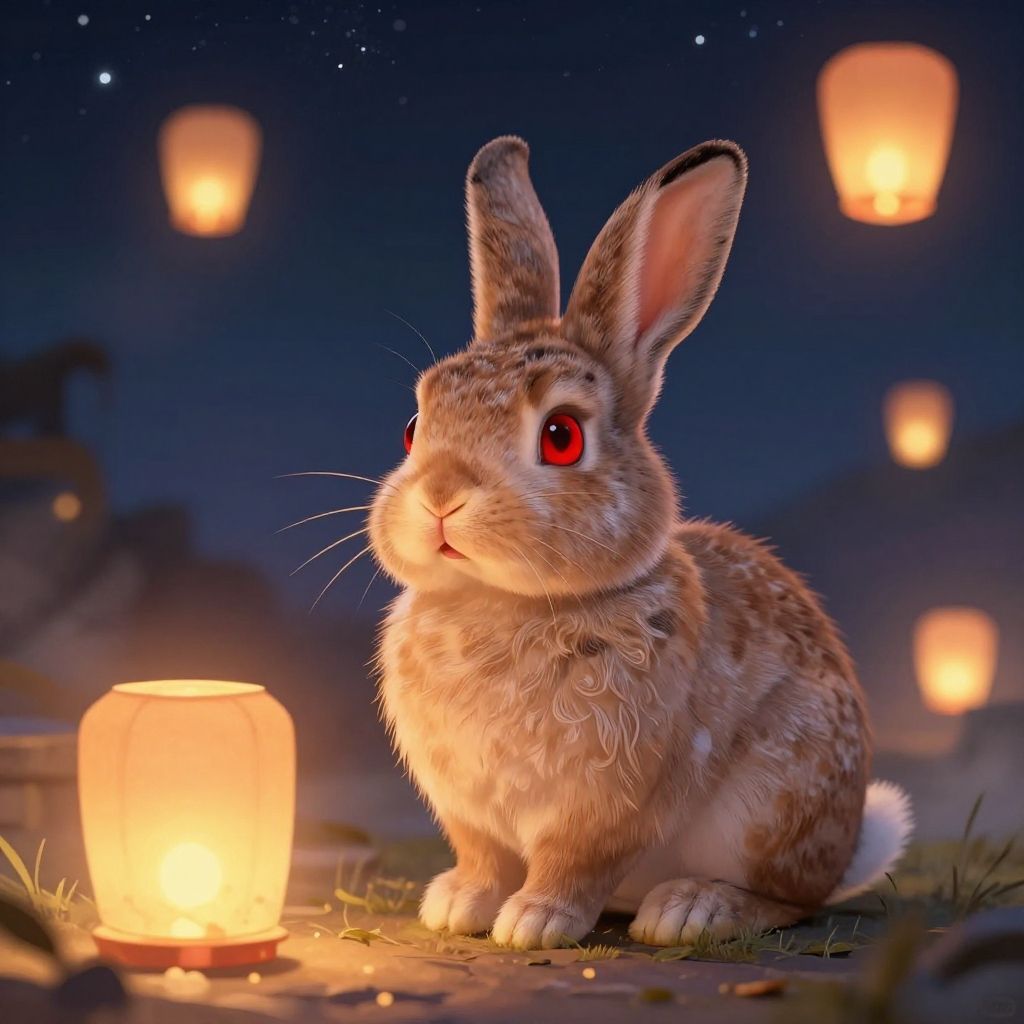 Bunnys with red eyes under a starry night sky, surrounded by floating lanterns and gentle mist, intricate fur patterns, warm glowing ambient light