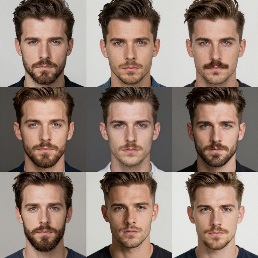 This is a digitally created image featuring a grid of nine headshots of a Caucasian male with light skin, blue eyes, and dark brown hair styled in various ways. He has a trimmed beard and mustache in most shots. The background is plain and white or gray, highlighting the subject. The man's expressions are neutral to slightly serious. He wears a dark blue shirt in some shots and a black shirt in others. The headshots are arranged in a 3x3 grid, showing different hairstyles and slight variations in his facial hair. The image has a realistic, digitally rendered style.