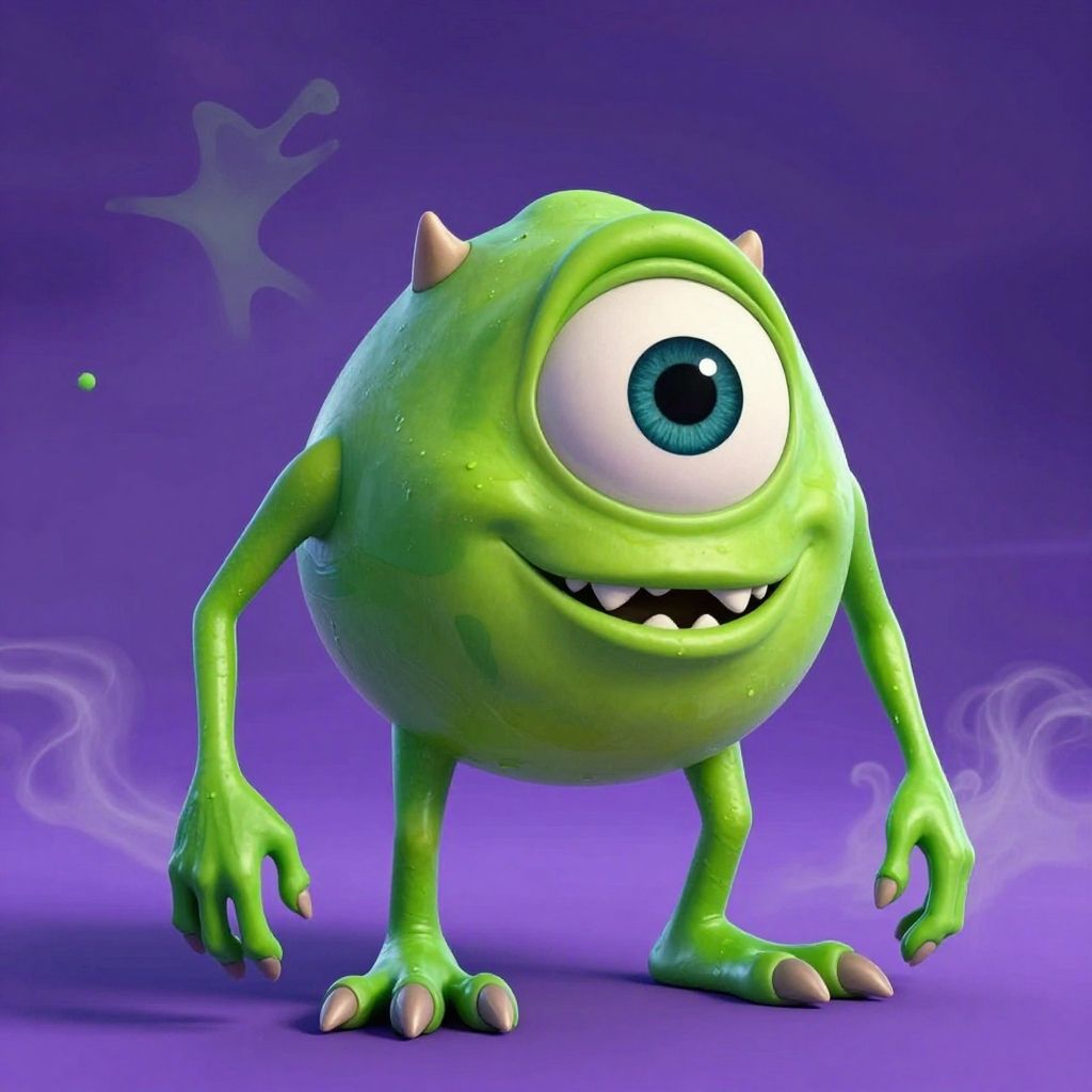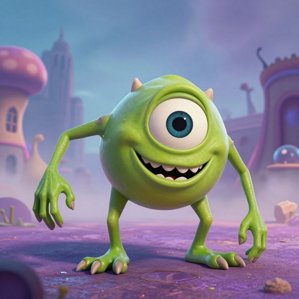 Distorted Mike Wazowski in a chaotic abstract style, warped proportions, melting textures, neon green and purple hues, surrounded by smoky surreal environment