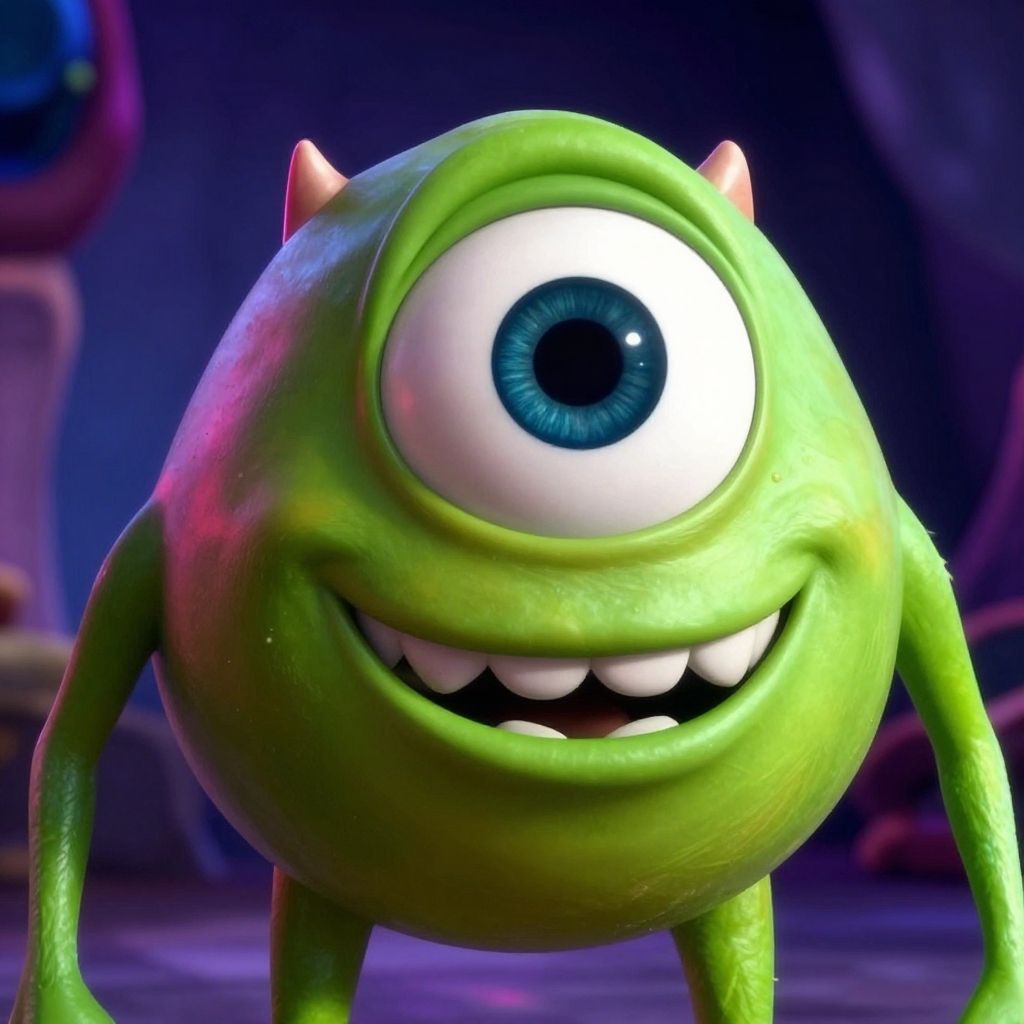 CGI green, one-eyed monster with horns, sharp teeth, and clawed hands stands on purple background; large eye, smirking expression.
