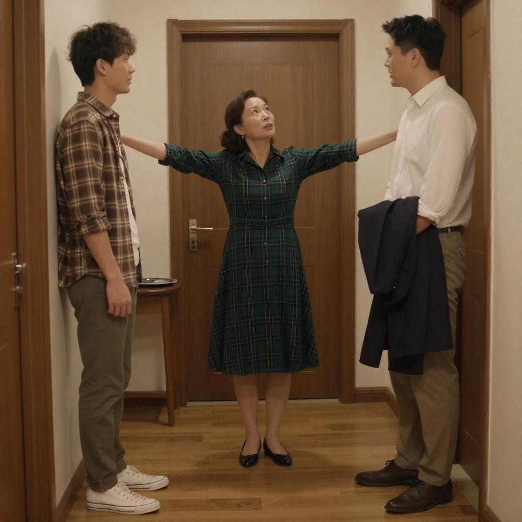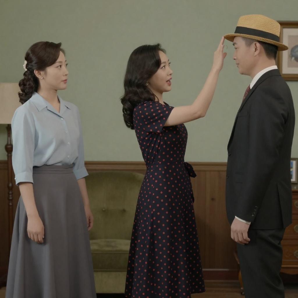 A vintage photograph of three people in a cozy room. A woman in a light blue blouse and gray skirt stands on the left, looking slightly away. A woman in a black dress with red polka dots and dark hair stands in the center, playfully touching the hat of a man in a black suit and yellow hat on the right. A green armchair is in the background.