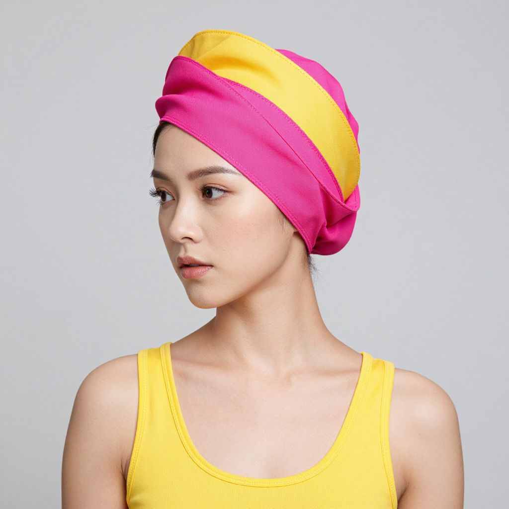 Woman wearing a vibrant pink and yellow headpiece, styled in a layered fashion, complementing her sleek yellow tank top against a neutral background.