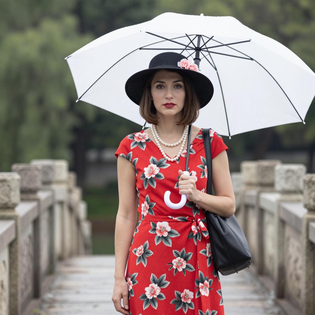 Woman in red floral dress holds white umbrella, wearing black hat with pink flowers and pearl necklace. Background: stone bridge, blurred greenery. Short brown hair, red lipstick, neutral expression. Black shoulder bag on right. Standing center, facing forward.