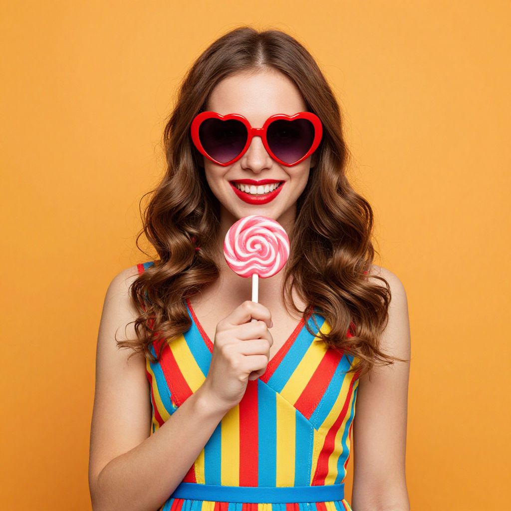 Photograph of a smiling woman with long, wavy brown hair, wearing red heart-shaped sunglasses, a colorful striped dress (red, blue, yellow), and holding a pink and white swirled lollipop. She's standing against a bright orange background, exuding a playful and cheerful vibe. Her red lipstick matches her sunglasses, adding a fun pop of color.