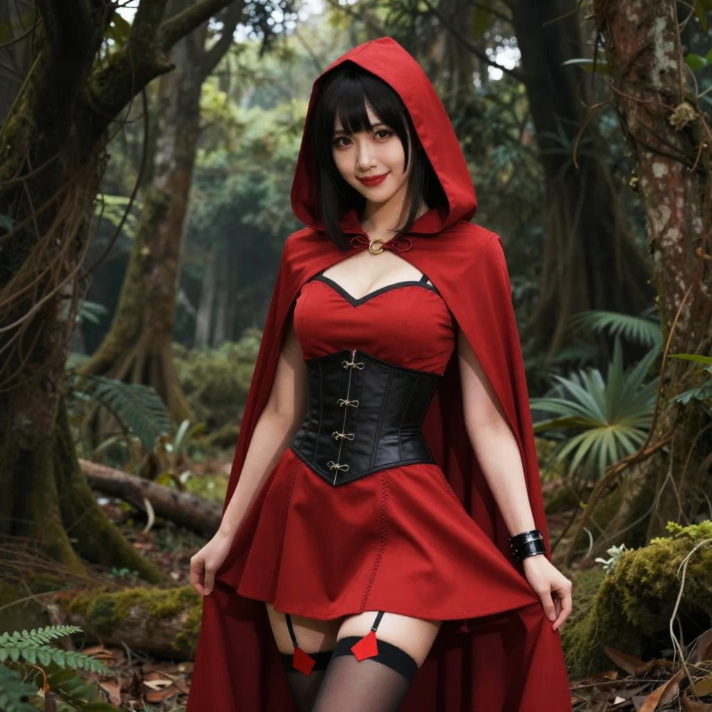 Photorealistic CGI of an Asian woman in a Little Red Riding Hood costume, red dress, black corset, garter, and thigh-high stockings