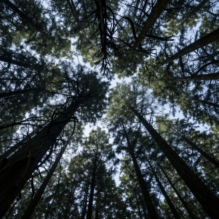 Photograph of a dense forest taken from a ground-up perspective, looking directly upwards. Tall, dark pine trees with thin, spindly branches stretch towards a bright, partly cloudy sky. The needles of the trees create a dense, textured canopy, with sunlight filtering through, casting dappled light and shadow patterns. The contrast between the dark silhouettes of the trees and the bright sky creates a dramatic, almost surreal atmosphere. The image captures the verticality and depth of the forest, emphasizing the towering height of the trees and the complexity of their intertwined branches.