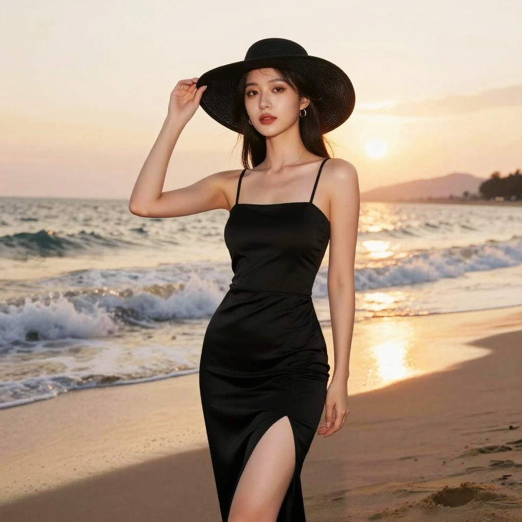 A stunning woman in a sleek black dress and wide-brimmed hat poses confidently on the beach at sunset. The soft waves and golden light create a serene yet captivating atmosphere, highlighting her elegance and beauty.