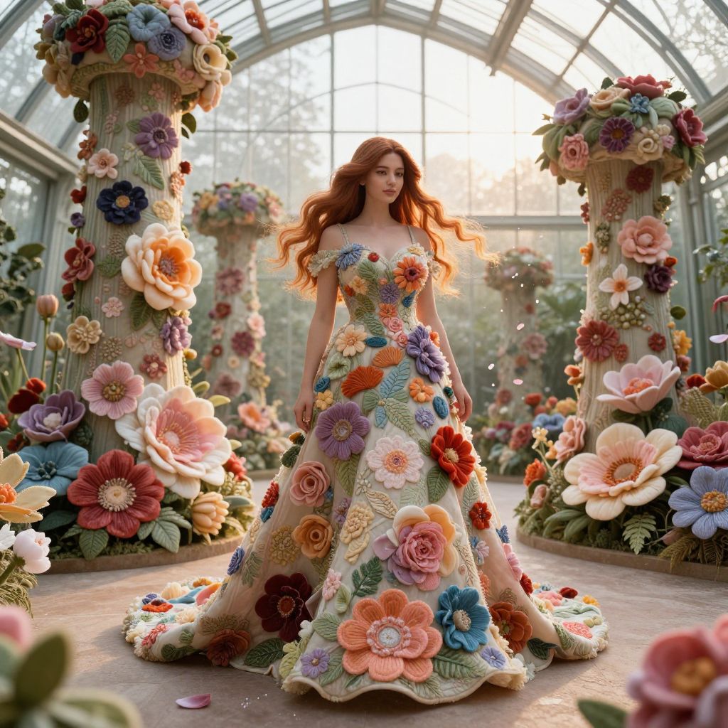 A breathtaking 3D floral couture garden scene featuring a vibrant textile flower explosion, with intricate, lifelike flowers made of soft silk and embroidered fabric cascading from towering avant-garde fashion structures. A realistic, ethereal woman with long flowing auburn hair and gentle brown eyes stands in the center, wearing a flowing gown woven with blooming textile flowers that appear to be alive and pulsing with color. The setting is a sun-drenched greenhouse at dawn, with golden light filtering through glass panels and dew-covered petals gently drifting in the air.. The woman has big tits and cute face