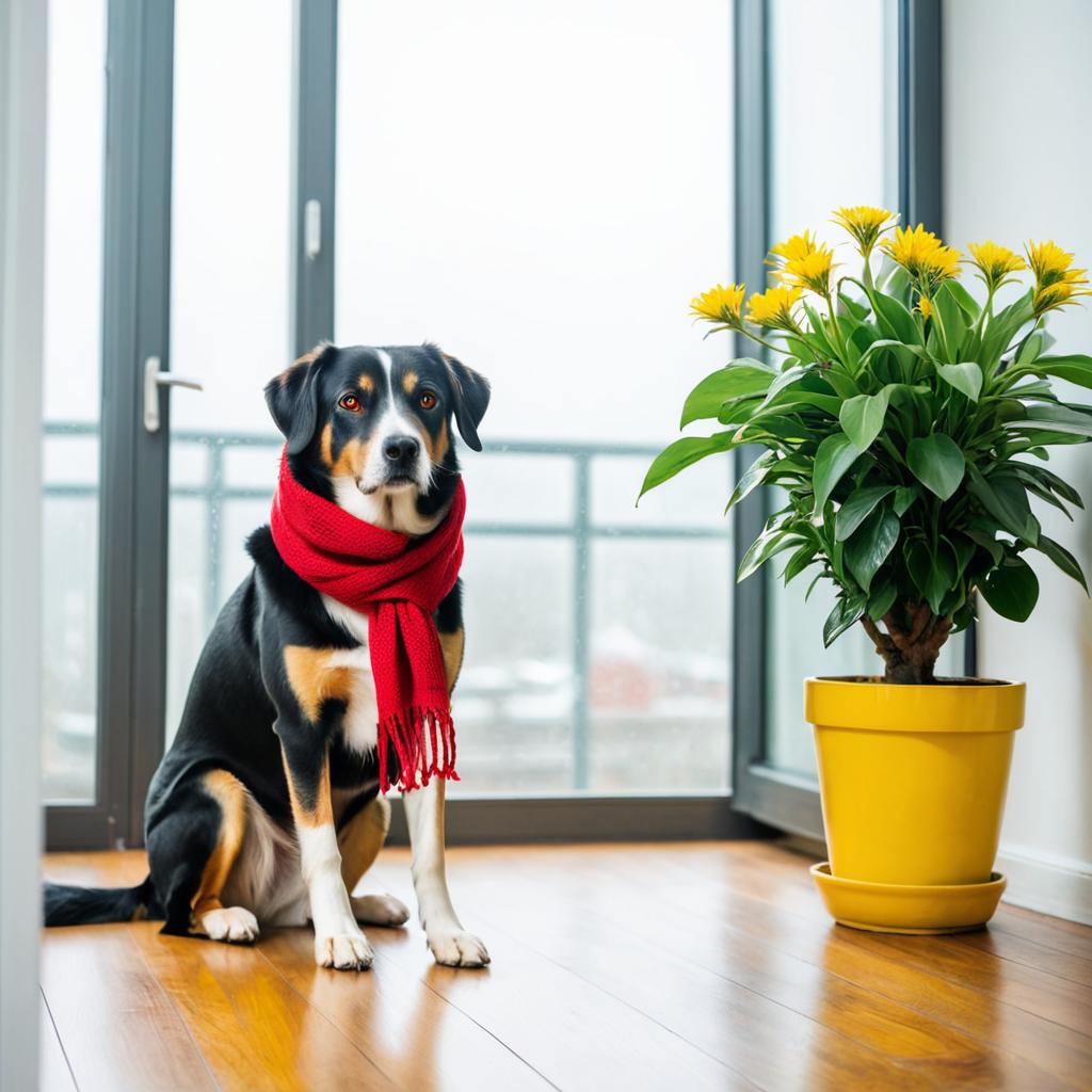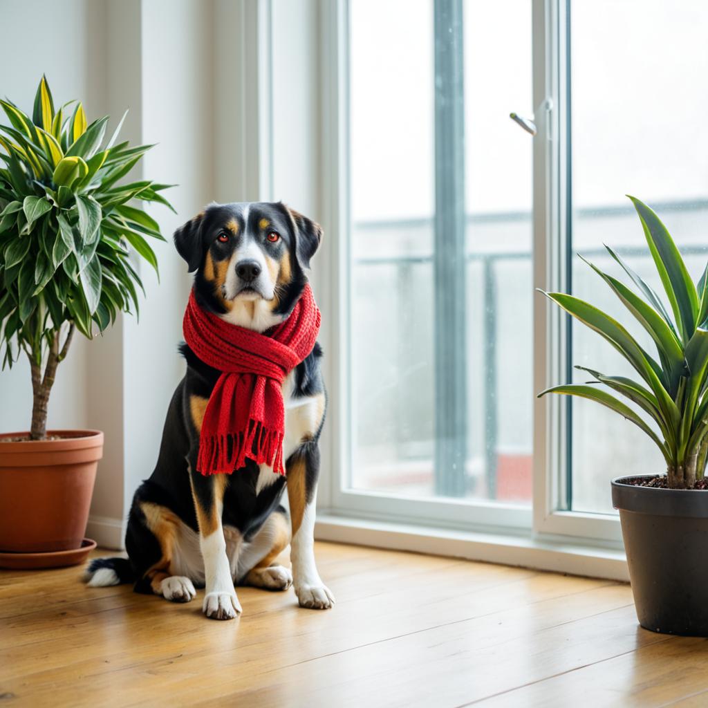 No humans, plant, scarf, window, dog, animal focus, potted plant, indoors, animal, red scarf, solo, looking at viewer, closed mouth, wooden floor, yellow eyes