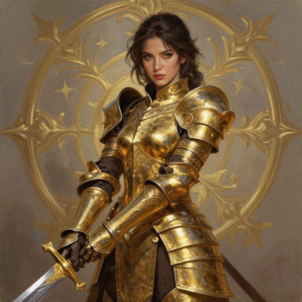 Digital artwork of a stern-faced woman with dark, wavy hair, wearing ornate, golden medieval armor with intricate designs. She holds a sword in her right hand, positioned at her side. Her armor is shiny, with detailed engravings, and she wears black gloves. The background features a golden, circular, ornate emblem with star-like patterns, set against a muted, grayish-brown backdrop. The image has a realistic yet slightly fantastical style, emphasizing the character's strength and regality. The lighting highlights the armor's gleam, adding depth and realism to the image.