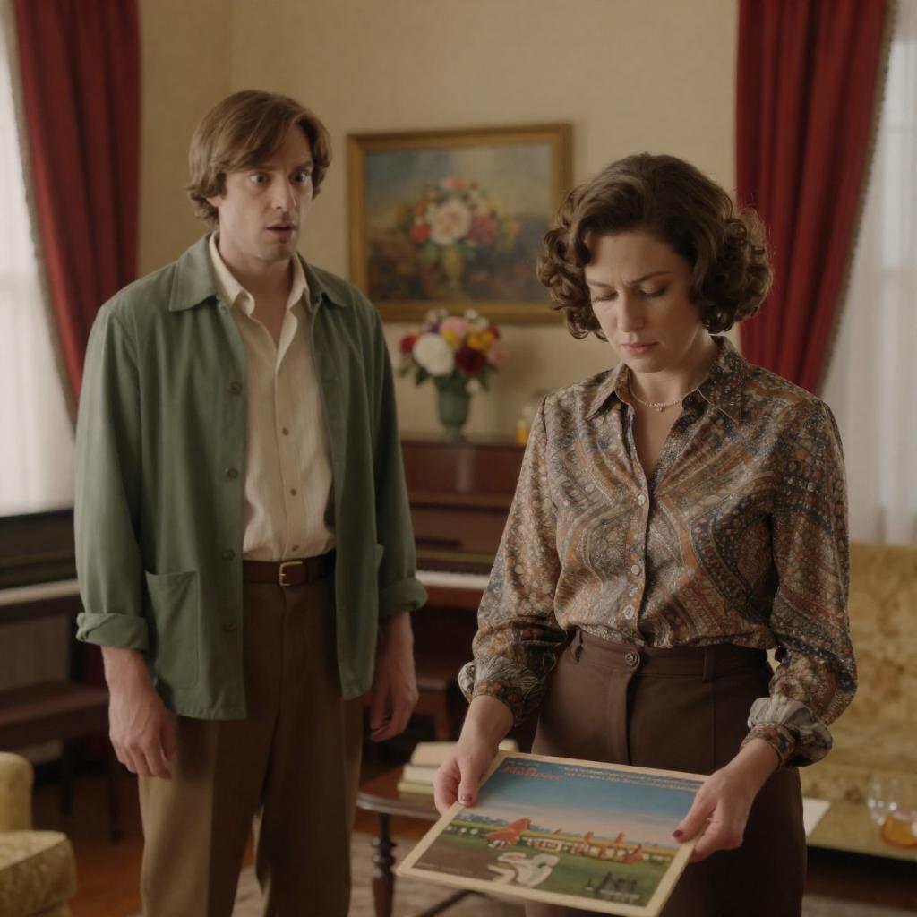 Photograph of two people in a vintage living room. Woman with short curly brown hair, patterned blouse, holding album cover, looking down. Man with medium-length brown hair, open green jacket, brown pants, looking surprised. Red curtains, piano, floral painting, flowers on table in background. Woman on right, man on left. Woman holding album cover in front of her, man standing to her left.