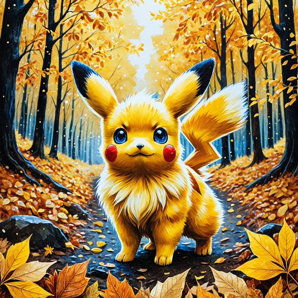 Portrait of a Eevee, with soft fluffy caramel fur and bright amber eyes, golden mane, in a sunlit autumn forest with golden leaves, gorgeous, warm, stunning, Pokemon Vulpix. detailed watercolor style on soft paper, intense, highly detailed, golden ratio, complementary colors, vibrant colors, vivid colors, deep colors, symmetric, 8k