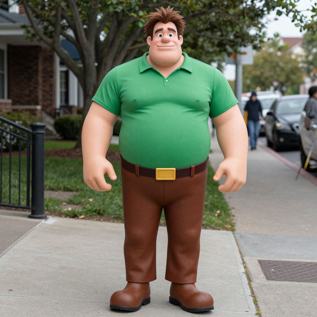 CGI image of a chubby, Caucasian man with brown hair, green polo shirt, brown pants, and brown belt, standing on a suburban sidewalk.