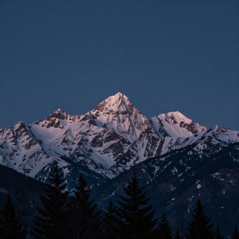 Moonlit peaks rise majestically against a starry sky, casting a serene glow over snow-capped mountains and silhouetted evergreens below.