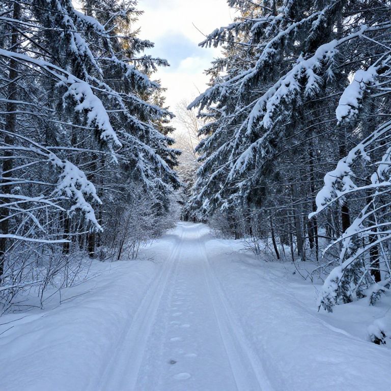 Photograph of a snowy forest path flanked by tall, snow-covered pine trees. The path, blanketed in white, leads into the distance, creating a sense of depth. The sky above is bright with patches of clouds, contrasting with the dark green needles of the trees. Bare branches on either side of the path are dusted with snow, adding texture. Footprints are faintly visible in the snow, indicating recent passage. The overall scene is serene and cold, with a crisp, wintry atmosphere.