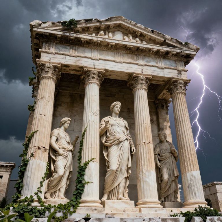 Photograph of a classical Greek temple with four towering, fluted marble columns. Three statues of draped, robed women stand between the columns; one holds a staff, another clasps her hands, and the third holds a scroll. Ivy climbs the columns. A dramatic, dark stormy sky looms above, illuminated by a bright, jagged lightning bolt to the right. The temple's stone texture is weathered, and the overall scene evokes a sense of ancient grandeur and natural power. The image is highly detailed with vivid contrasts between the white marble and dark sky.