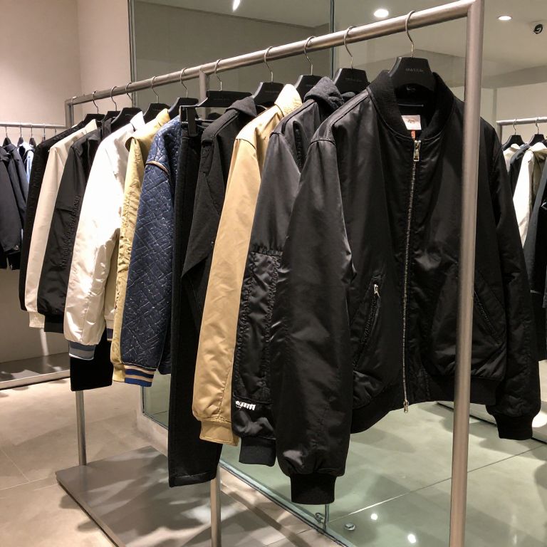 Photograph of a modern clothing store display featuring a metal rack with various jackets on black hangers. The jackets include black, beige, navy blue, and white colors, with textures ranging from smooth to quilted. The background shows a mirrored wall reflecting more clothing, and the floor is tiled with large, light gray squares. The lighting is bright and even, highlighting the jackets' details and colors. The overall style is minimalist and contemporary.