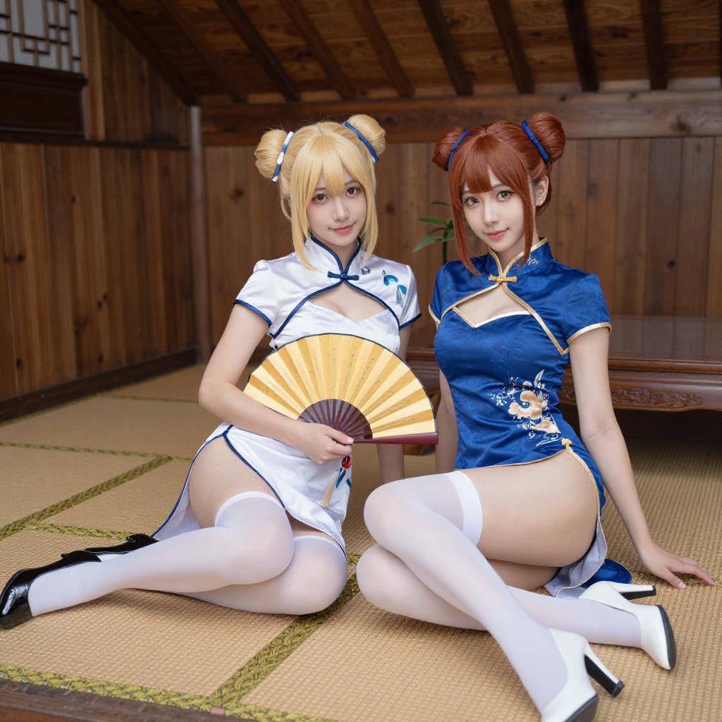 Photograph, two women, asian dresses, blue and white dresses, floral patterns, cleavage, red hair, blonde hair, double buns, sitting on floor, wooden room, traditional chinese room, high heels, white thigh-high stockings, yellow fan, smiling, fair skin, beautiful, attractive, traditional chinese clothing, wood ceiling, tatami mat floor, chinese style, cosplay, cultural attire, detailed background, natural light, elegant, stylish, traditional architecture