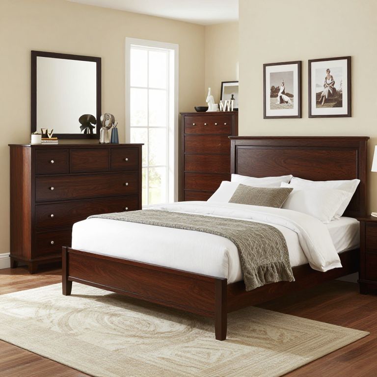 Photograph of a modern bedroom with a dark wooden bed, white linens, beige rug, matching dark wooden dresser and nightstand, black-framed