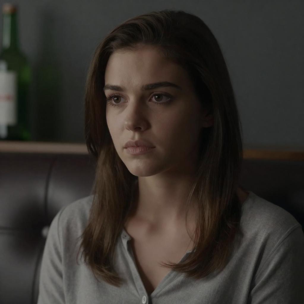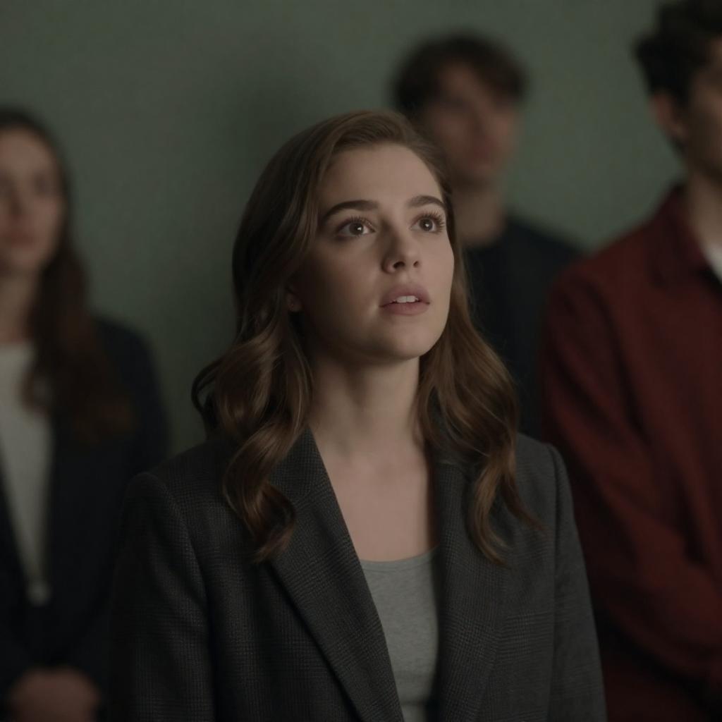 Photograph of a young woman with long, wavy brown hair, wearing a dark velvet jacket over a white lace-trimmed blouse. She leans against a dark, ured wall, looking to the side with a serious expression. Dim, warm lighting. Background includes a dark, wooden-framed window with reflections. One hand rests on her thigh.
