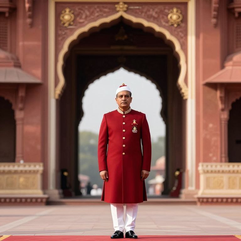 A royal-style sherwani worn by a dignitary during a state ceremony, deep red with royal emblems, standing in front of a grand archway in a historical royal palace, ceremonial setting, royal atmosphere, regal presence, high-definition, dramatic lighting