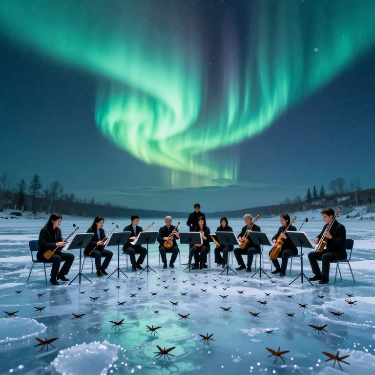An entire symphony orchestra made of frozen water striders performs beneath a floating aurora no wind can touch.