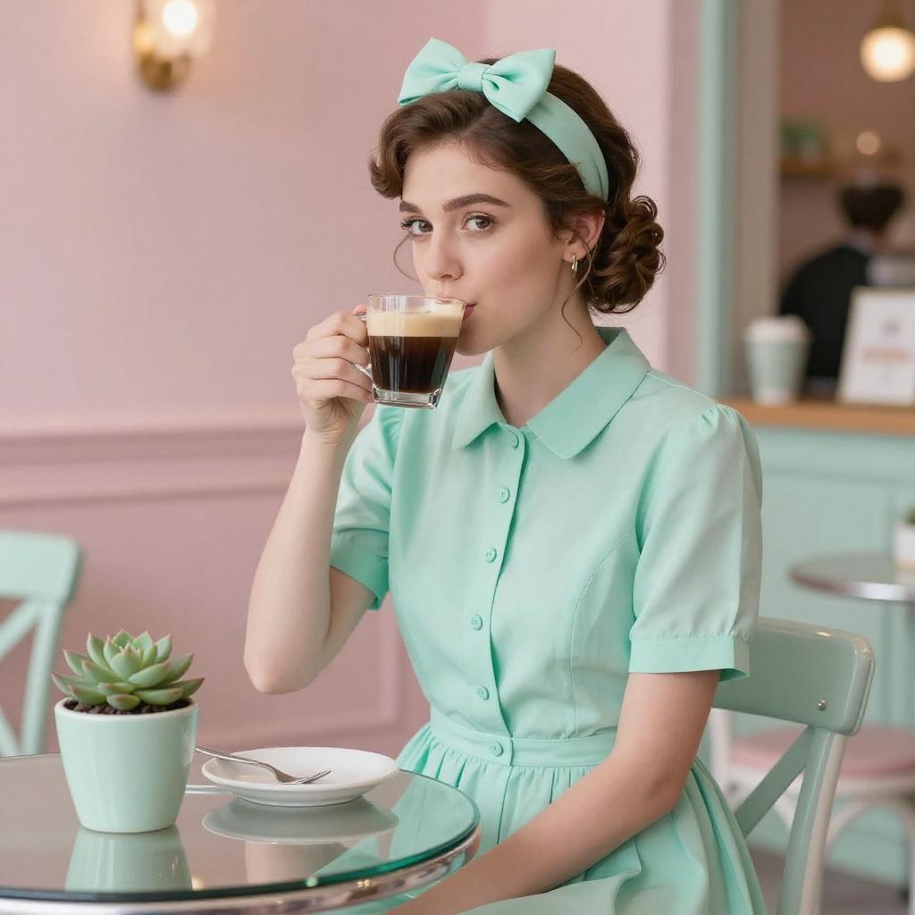 A sophisticated young woman seated in a Parisian café, styled with an Art Nouveau influence. She has graceful hair arranged in a classic updo adorned with a flower, wearing an ultra-chic vintage dress with detailed embroidery and sheer puff sleeves. The background features intricate decorative art period elements characteristic of Alphonse Mucha's style. She holds an ornate teacup, embodying luxury and elegance.