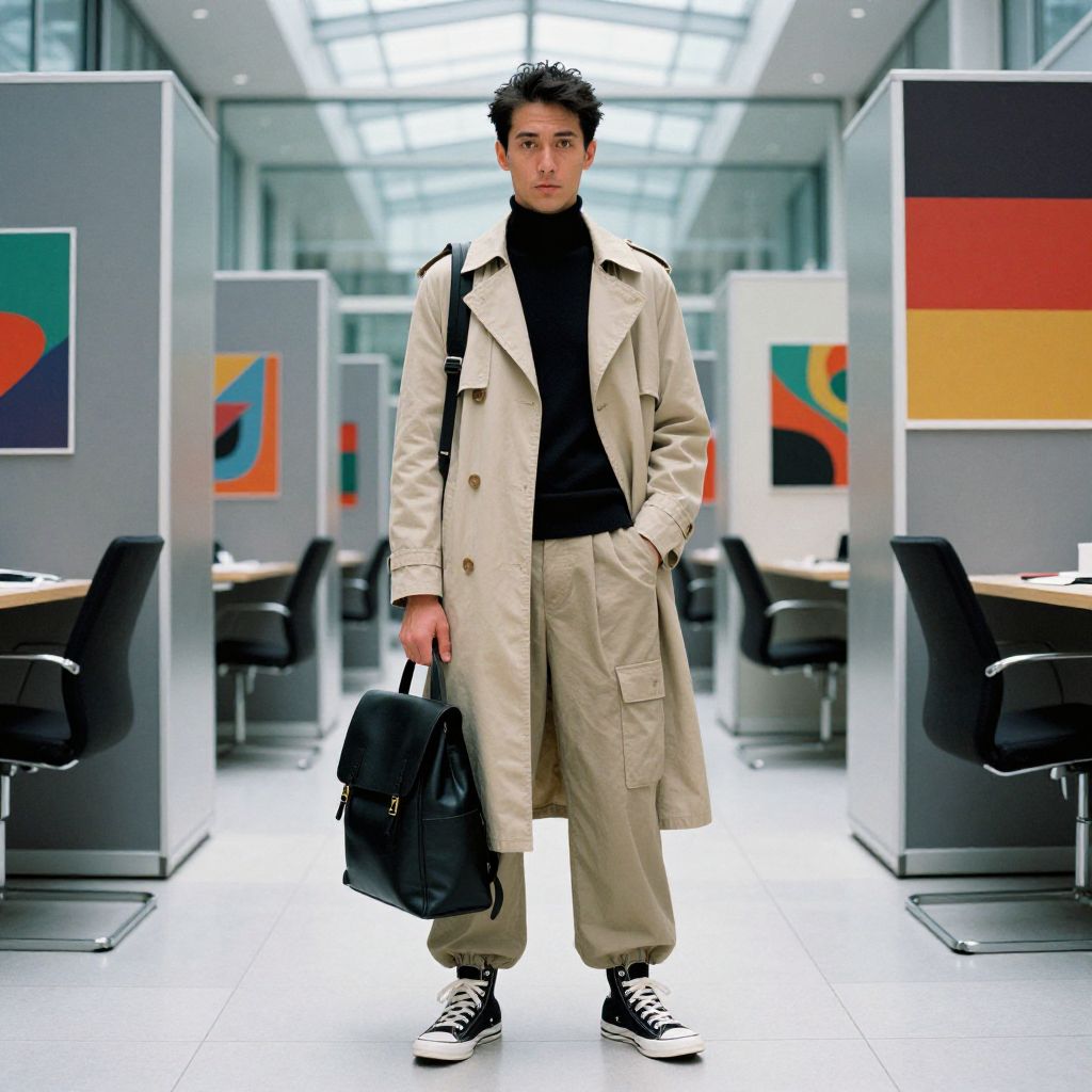 A man, tailored beige trench coat, fitted black turtleneck, wide-leg cargo pants, high-top designer sneakers, minimalist leather backpack, modern glass atrium, sleek study pods, vibrant art installations, anscochrome analog film, confident expression. Man has masculine face and piercing eyes