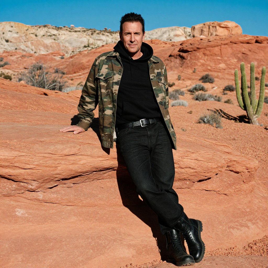 A man, camo field jacket, loose-fit black hoodie, straight-leg black denim, combat boots, textured black leather belt, red rock formations, scattered cacti, brilliant blue sky, oversaturated film, leaning against a rock, confident smile.Man has masculine face and piercing eyes