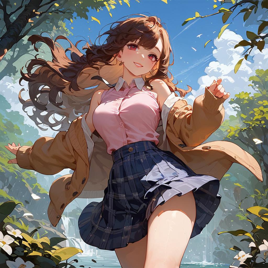Score_9, score_8_up, score_7_up, source_anime, 1girl, solo, dating, joyful, smile, parted lips, looking at viewer, taller than vewer, outdoors, sunbeam, blue sky, nature, plant, wind, tall female, long hair, brown hair, wavy hair, brown eyes, medium breasts, perky breasts, casal wear, pink shirt, bare shoulders, cardigan, plaid skirt, blue skirt, thighs