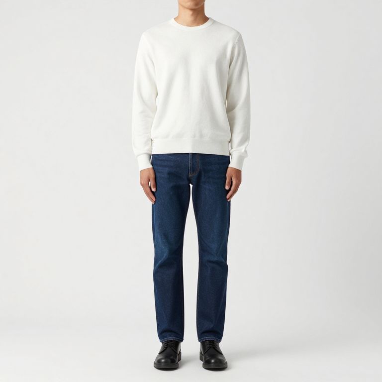 Photograph of a person standing against a plain white background. The individual is wearing a plain white crew-neck sweatshirt, dark blue straight-legged jeans, and black dress shoes. Their head is cropped out of the image, and their arms hang naturally by their sides. The lighting is even, eliminating shadows, and the focus is sharp, highlighting the simplicity and contrast of the white sweatshirt against the dark jeans. The style is minimalistic and clean.