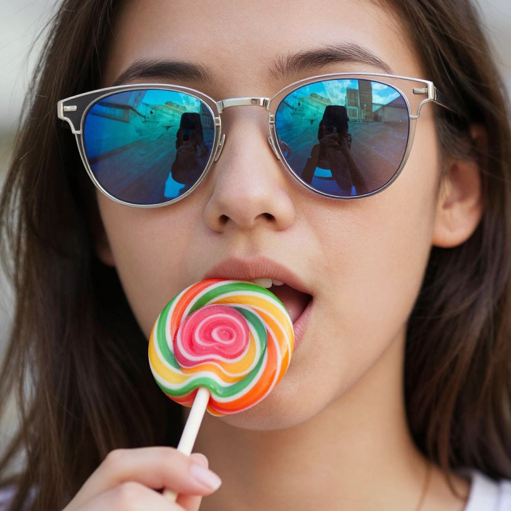 A vibrant, photo-realistic depiction of a young woman enjoying a colorful lollipop, featuring reflective sunglasses that mirror the surrounding environment, captured in crisp detail with a high-definition, artistic focus on texture and light.