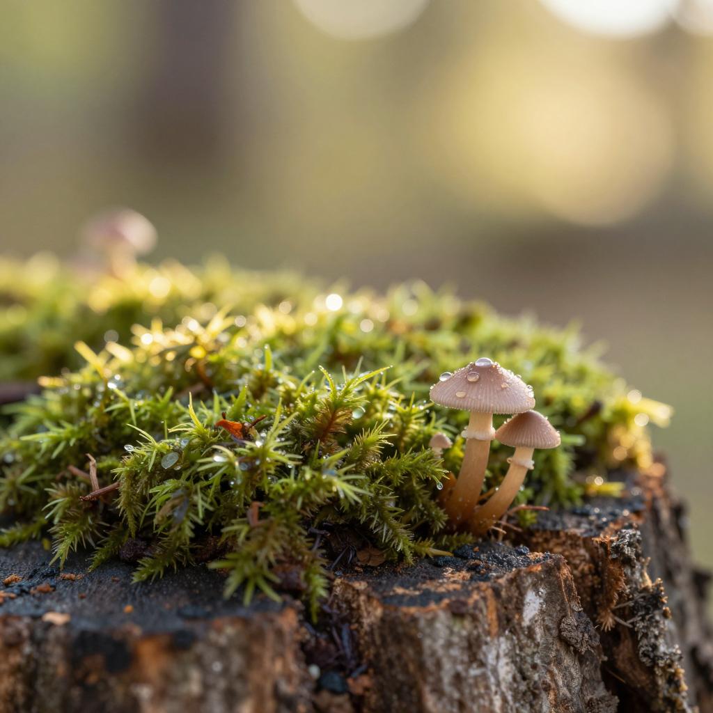 Macro close-up of dewy green moss and tiny mushrooms on rough bark of a tree stump under golden hour sunlight filtering through leaves, 8K resolution, minimalistic, bright, authentic, healthy, vibrant, photorealistic.