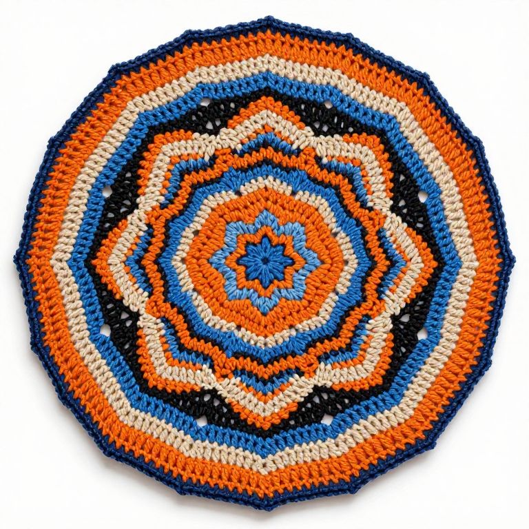 Circular crochet artwork by Trevor Smith showcases a vibrant mandala design with symmetrical patterns featuring concentric layers of orange, blue, black, and beige hues, intricately crafted with detailed textures and a scalloped border.