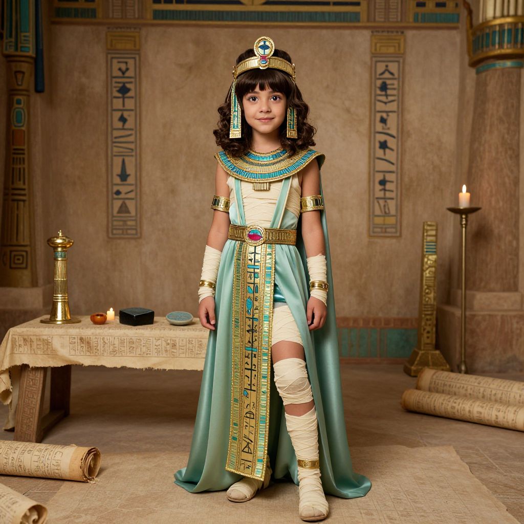 A realistic photograph of a young girl in a detailed mummy princess costume, wearing a long, flowing green and gold dress with hieroglyphic patterns, a golden crown with eye-like emblems, and a wrap-around shroud with mummy bandages on her arms and legs. She has bright, expressive eyes, soft curly brown hair styled in a bun, and a serene, playful smile. The setting is a dimly lit, ancient Egyptian-inspired room with painted walls, papyrus scrolls, and a candlelit table with small artifacts like stone tablets and a djed pillar.