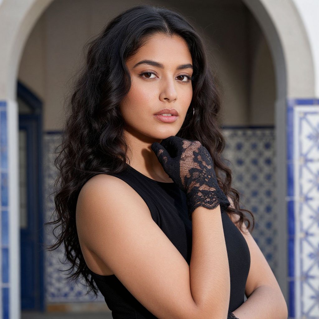Photograph of a beautiful woman with long, wavy black hair and olive skin. She's wearing a sleeveless black top and lace gloves, standing in a sunlit, arched doorway with blue and white patterned tiles in the background. She has a serious, confident expression, with her right hand touching her chin. The lighting highlights her natural beauty and the textures of her lace gloves.