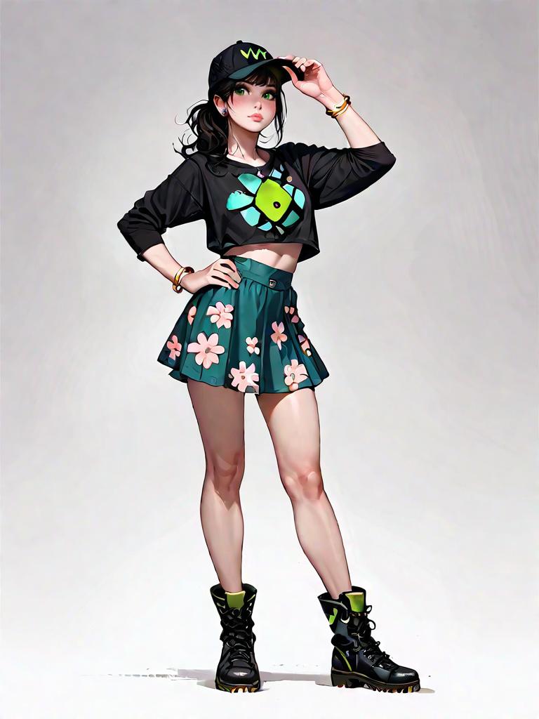 Full body portrait of a young woman standing in a studio setting with a plain gray background. She wears a black cropped baseball tee with turquoise and green graphic design, a teal floral print mini skirt with pink flowers, black ankle boots with olive green accents, and a black cap. She accessorizes with gold bangle bracelets and poses confidently with one hand on her hip and the other adjusting her cap.