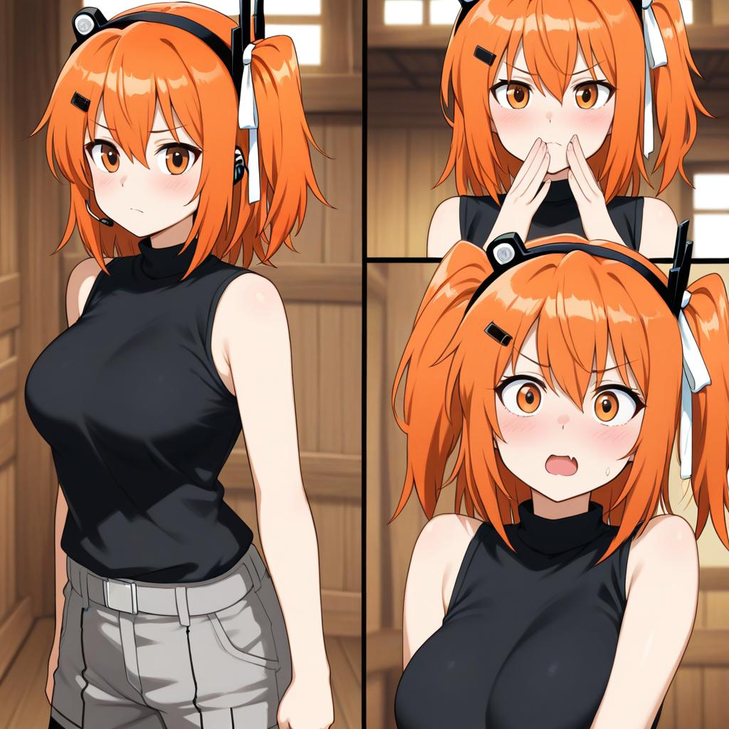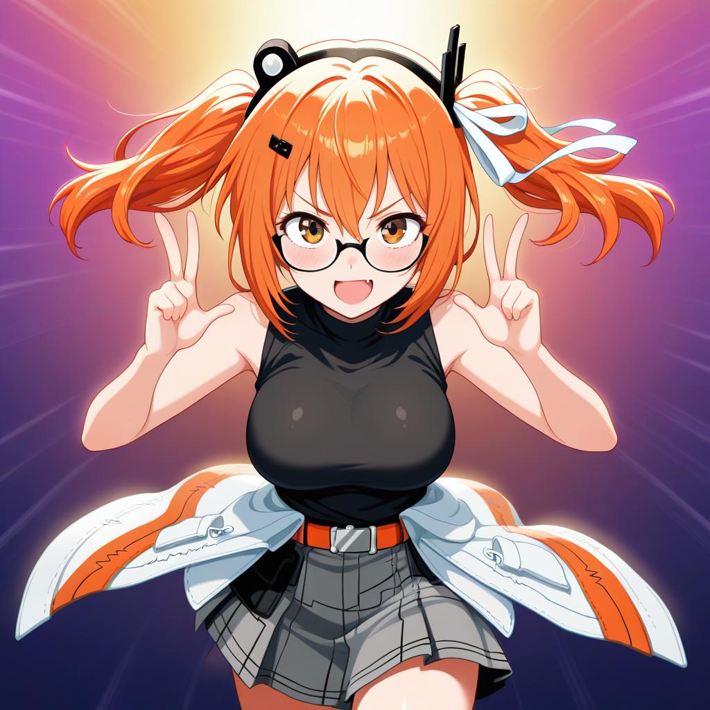 Digital illustration of an anime-style girl with bright orange twin-tail hair, wearing round black glasses and a black sleeveless top. She has a gray pleated skirt and a white jacket tied around her waist. The character is making a playful hand gesture with both hands, set against a vibrant purple and orange gradient background with dynamic lighting effects.