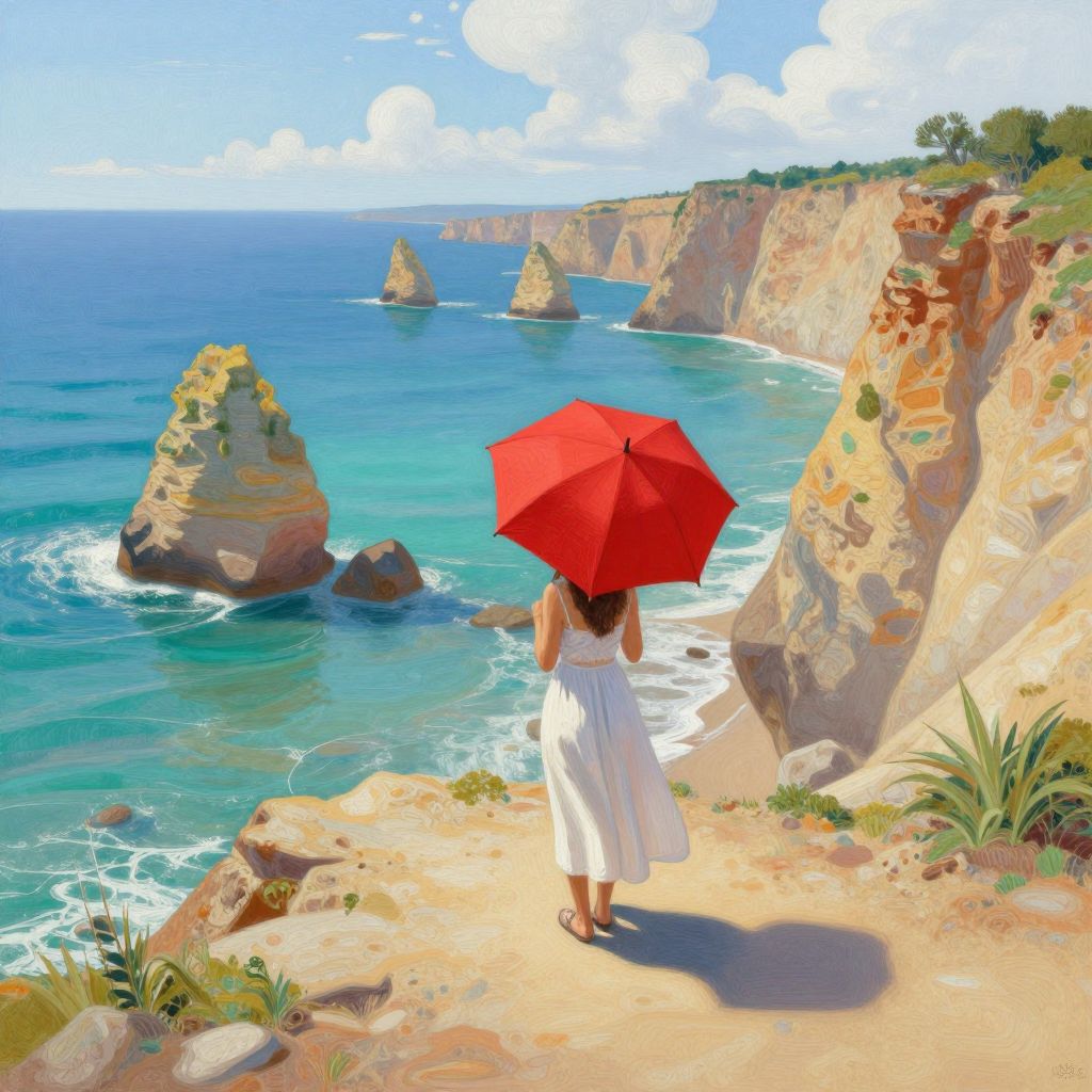 Digital painting of a woman in a white dress holding a red umbrella, standing on a cliff overlooking a vibrant blue ocean with rocky formations and a bright,