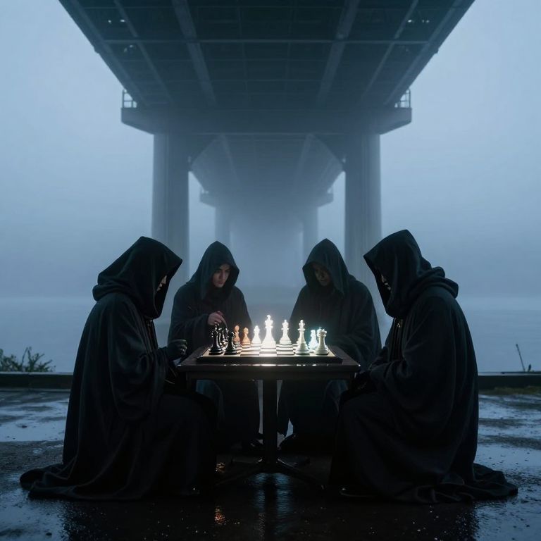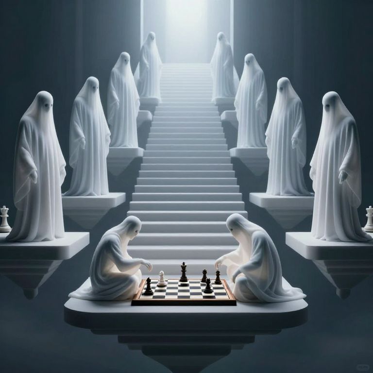 A digital art composition in the surrealist style, portraying an elaborate chessboard set within a foggy forest glade at dawn. Majestic, human-like chess pieces with intricate facial features embody the intensity and suspense of their game. As daylight filters through from behind the viewer, it casts elongated shadows over the mossy ground, revealing the ethereal presence of a cryptic figure in the background haze. This enigmatic character, emanating an air of mystery, appears to oversee the chess match with a sense of wisdom and intrigue, inviting contemplation on the deeper meanings concealed within this captivating scene.