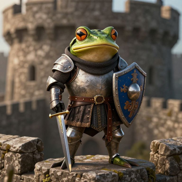 Frog character dressed as a medieval knight, holding a small sword and shield, standing boldly on a stone castle wall, epic fantasy vibe, rich textures and dramatic lighting