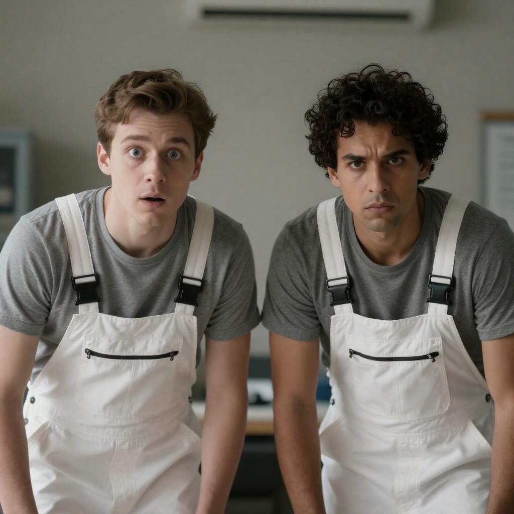 Two men standing on a street having an intense interaction. The man on the left has curly hair, a beard, and a red headband, dressed in a denim shirt with rolled-up sleeves and brown pants. He is holding a small white object, extending it towards the second man. The second man is wearing a red beanie, yellow tank top, beige pants with red suspenders, and gesturing with his hand near his mid-abdomen. Background shows a parked car, street sign, and colorful storefronts, suggesting an urban environment.