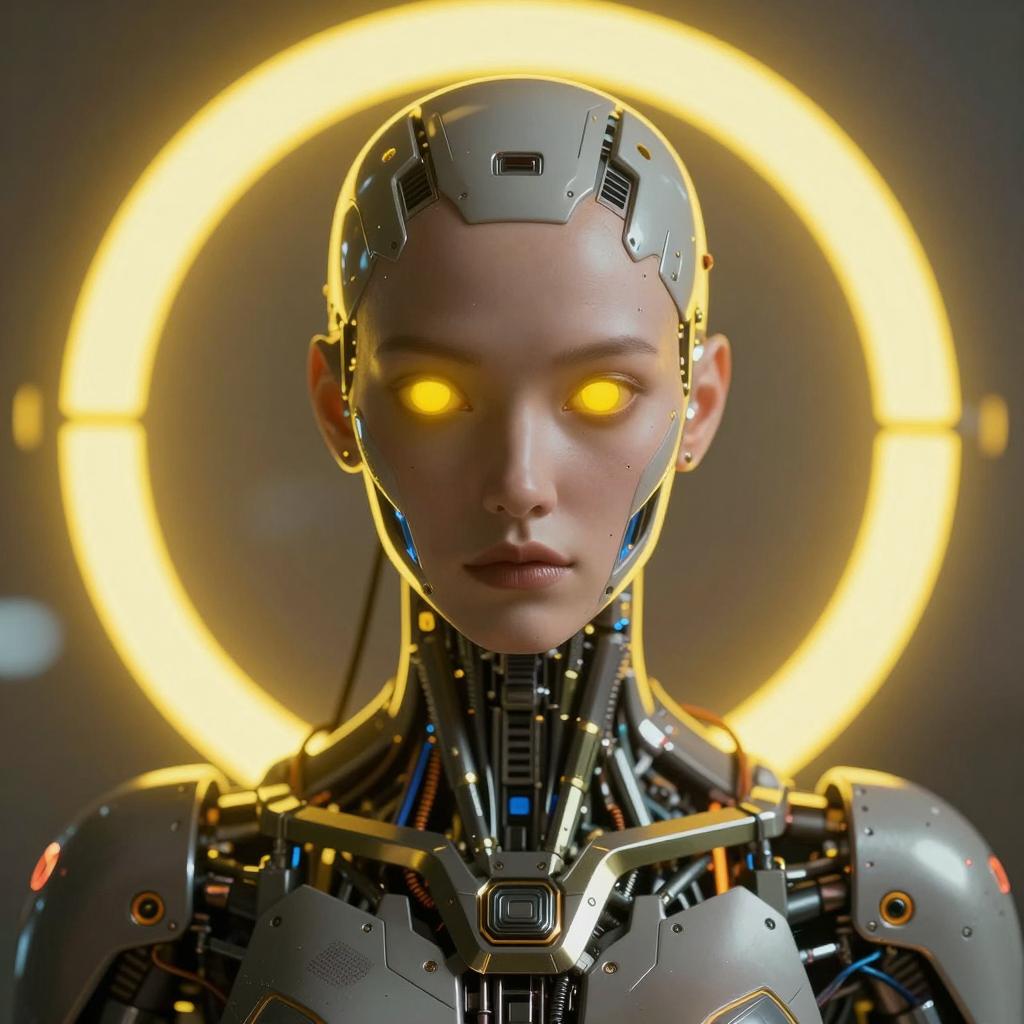 Close-up portrait of a futuristic female robot with a smooth, shiny, and geometric design. The robot has a sleek white and black body with intricate patterns, a high collar, and transparent extended components around its head. The background features neon pink and blue circuitry patterns that enhance the cybernetic atmosphere.