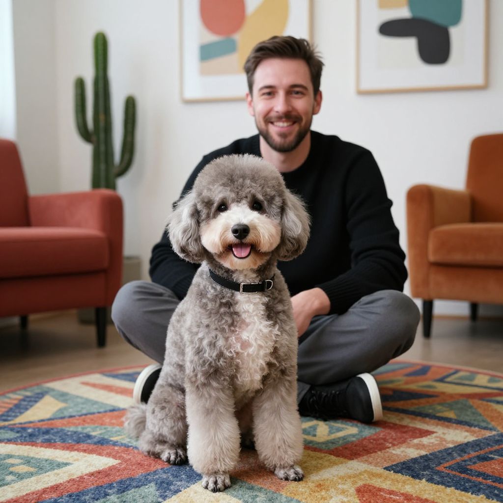 A photograph of a cute, fluffy, gray and white poodle with a black collar sitting in front of a smiling man with short brown hair and a beard, wearing a black sweater and gray pants. They're on a colorful, patterned rug in a cozy living room with a cactus, red chair, orange chair, and abstract art on the walls.
