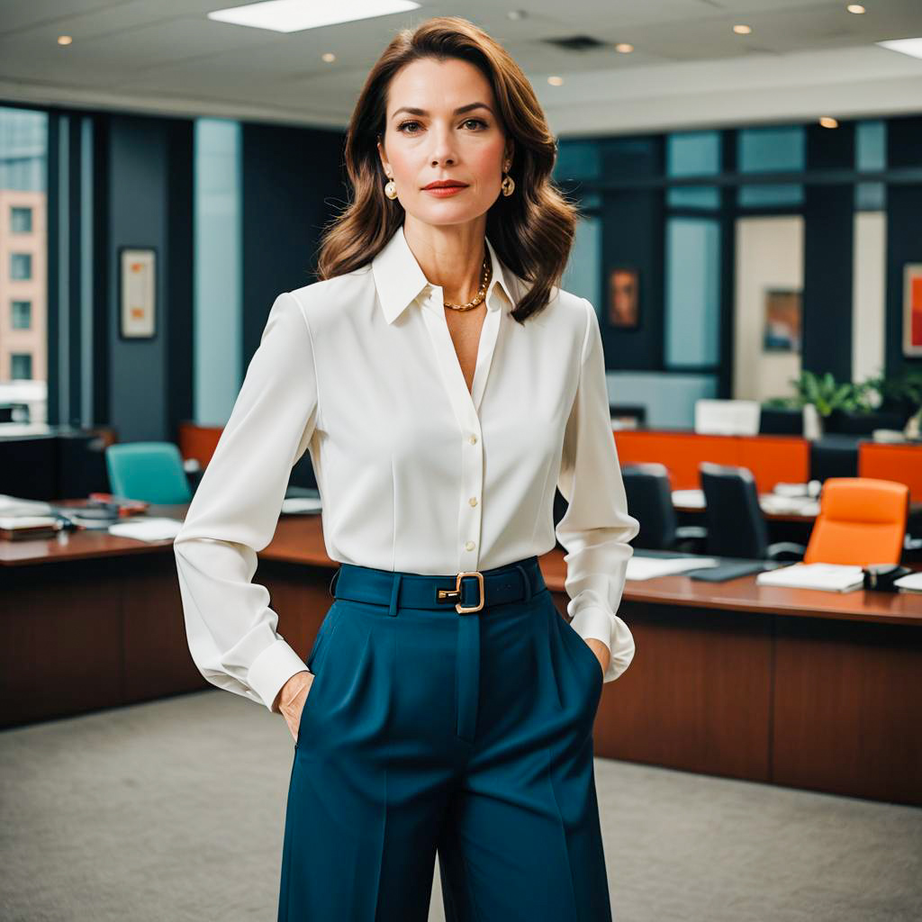 Wide-leg pants outfit, worn by business professional woman, featuring tailored wide-leg pants with a silk blouse, in bold statement colors, captured in corporate environment portrait.