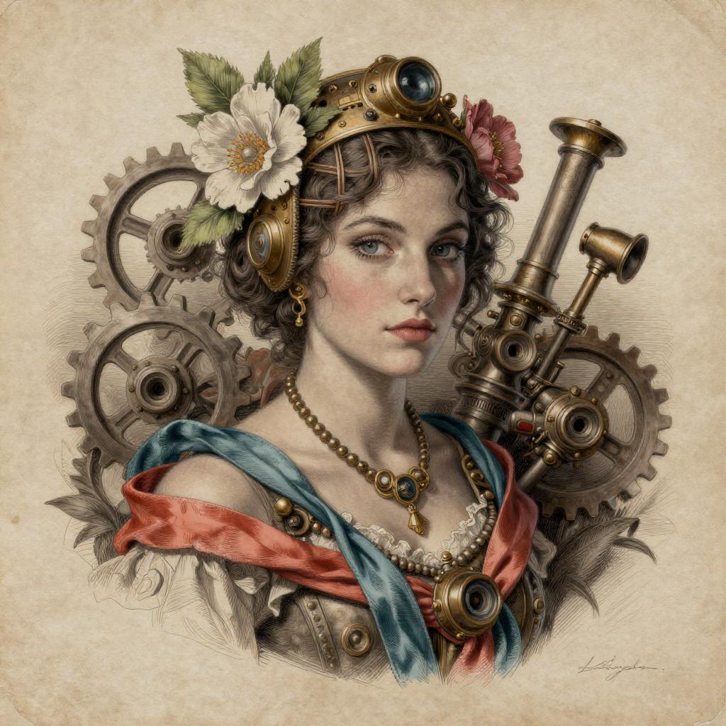 Style by Style-Empire, Charlie Bowater realistic Lithography sketch portrait of a woman, flowers, [gears], pipes, dieselpunk, multi-colored ribbons, old paper texture, highly detailed