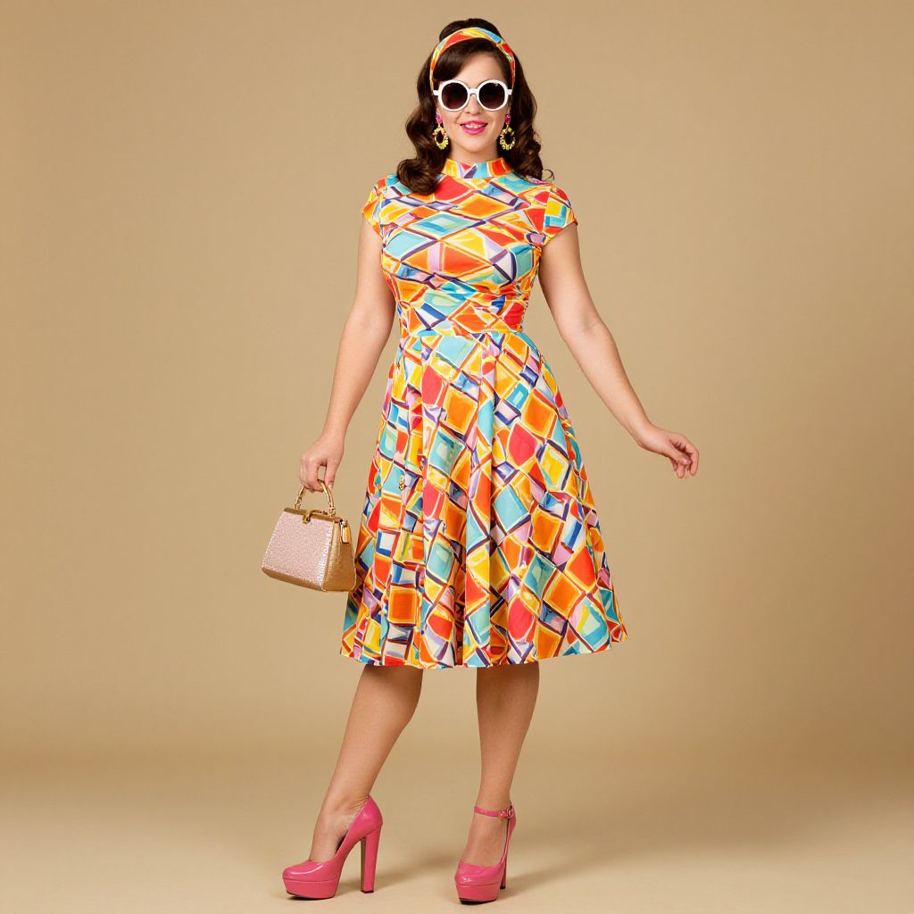 Photograph of a curvy woman with fair skin and dark wavy hair, wearing a colorful, geometric-patterned, knee-length dress with short sleeves. She accessorizes with pink high-heeled shoes, a pink headband, round white sunglasses, and a small beige handbag with a gold chain strap. She stands against a plain beige background, smiling and slightly leaning to her right. The dress features vibrant orange, yellow, blue, and red squares and lines, creating a retro, 1960s-inspired look. Her makeup is bold with red lipstick. The overall style is vintage and playful.