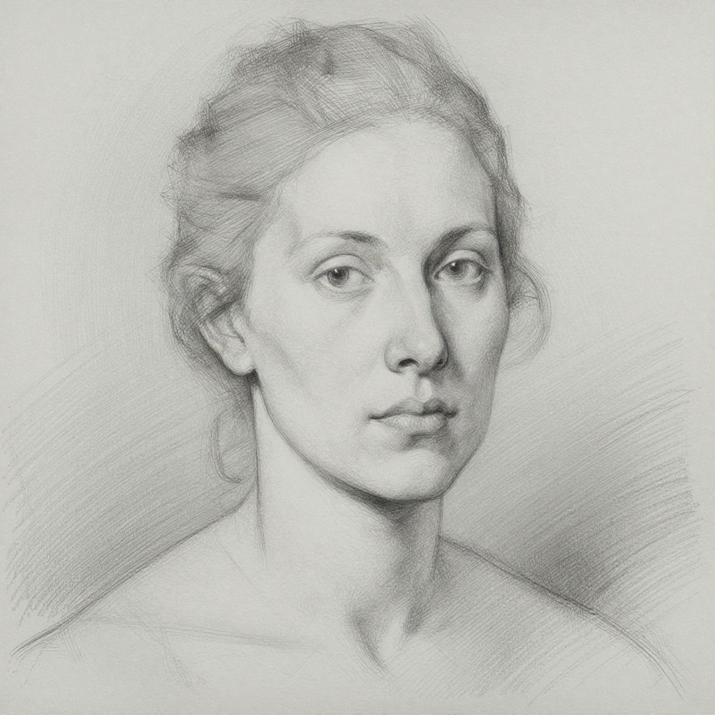 White chalk study of a womans portarit by arnold bocklin. fine detail showing the forms of the face. studio lighting. sketch where you can see the artists lines