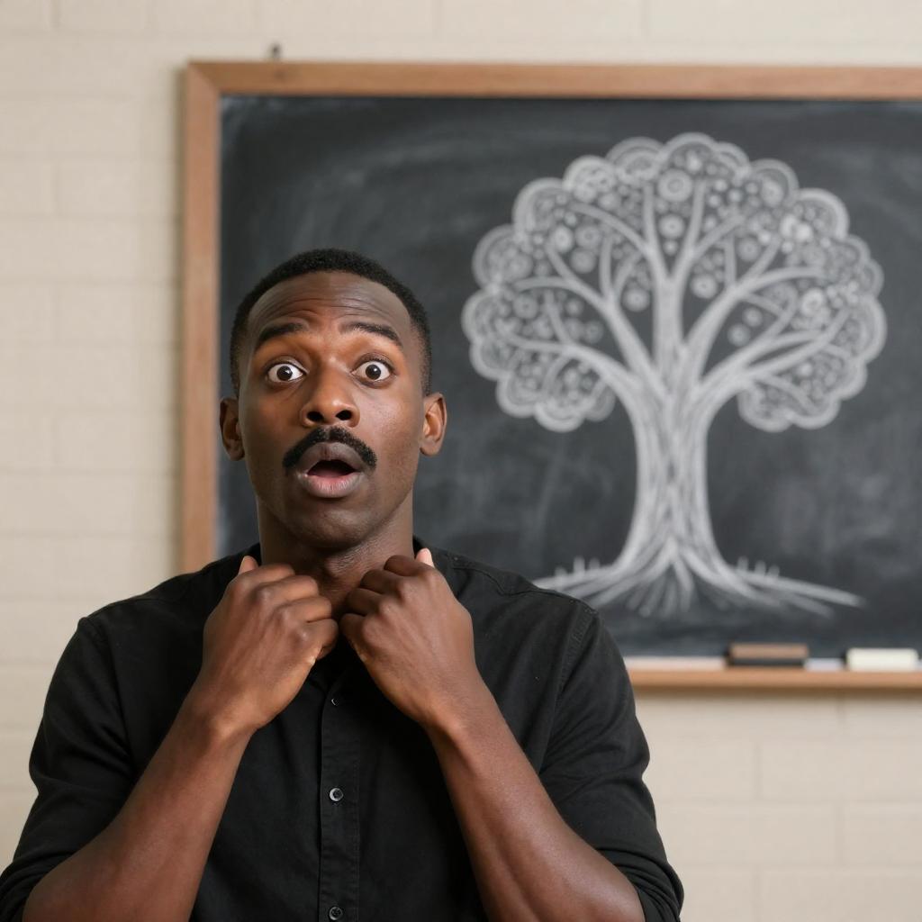 Photograph of a shocked Black man in a black suit with hands covering his mouth, wide-eyed expression. Background: collage of diverse people, various expressions, indoor and outdoor settings, green background. Upper row: mixed expressions, casual and formal clothing. Lower right: outdoor scene, white picket fence.